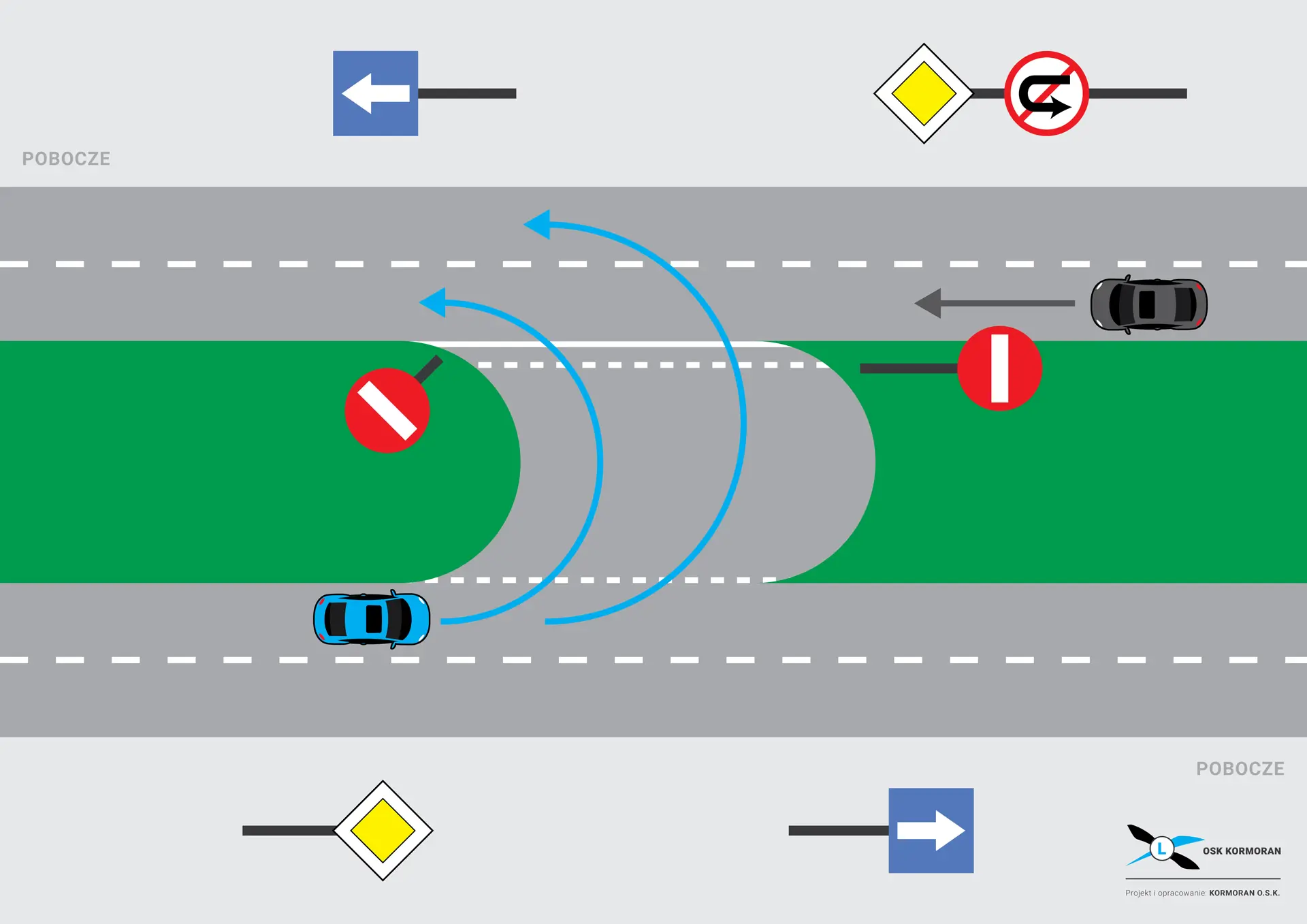 Znaki pionowe: przełączkę jednokierunkową rozpoznajemy po ustawieniu zakazów wjazdu (B-2) po tej samej stronie jezdni, co oznacza zakaz przejazdu od strony przeciwnej i jednoznacznie wskazuje kierunek dostępny do zawracania.