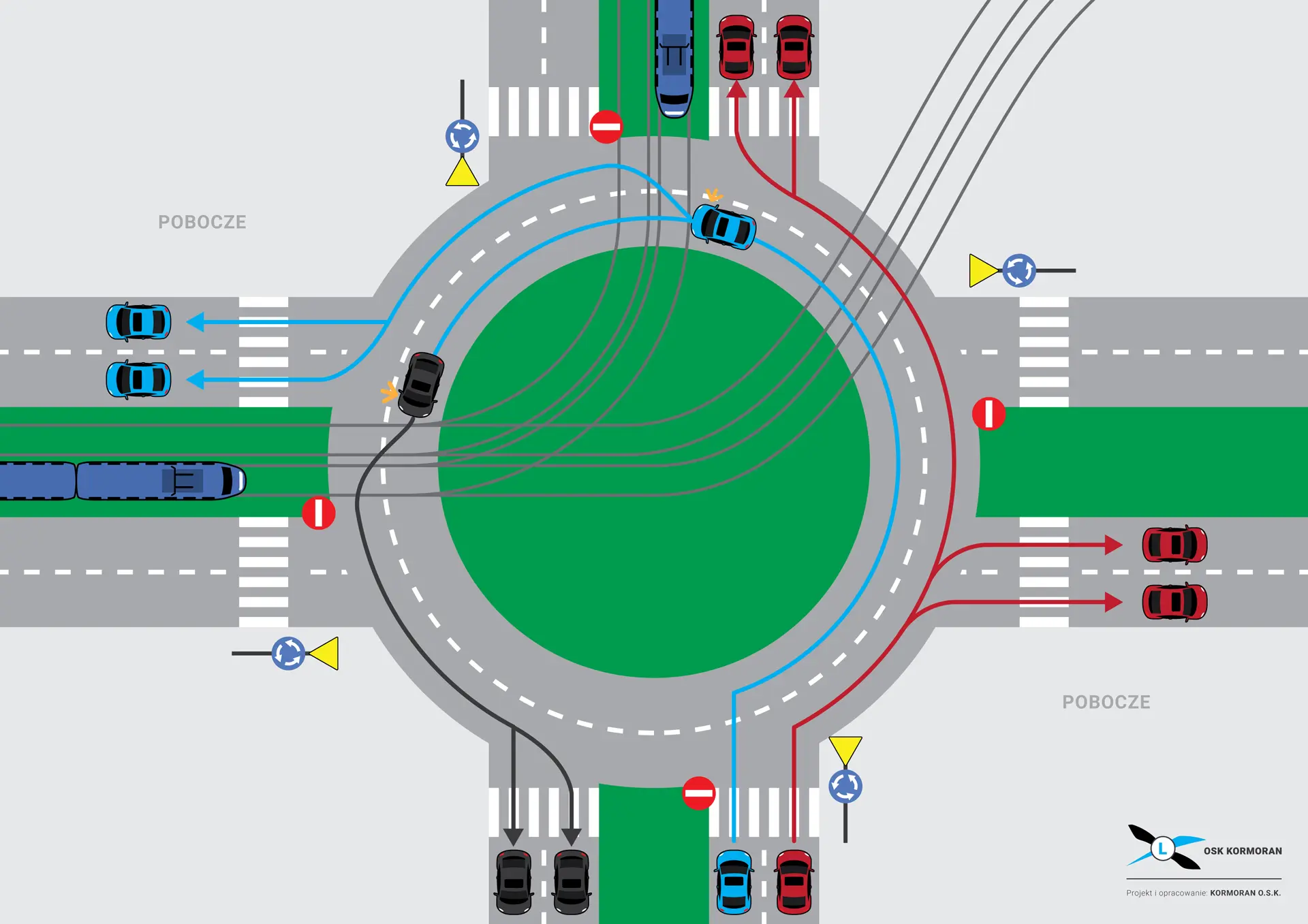 Zajęcie niewłaściwego pasa ruchu w fazie wyjazdu z ronda – szczególnie przy zawracaniu – może prowadzić do kolizji z pojazdem wjeżdżającym.