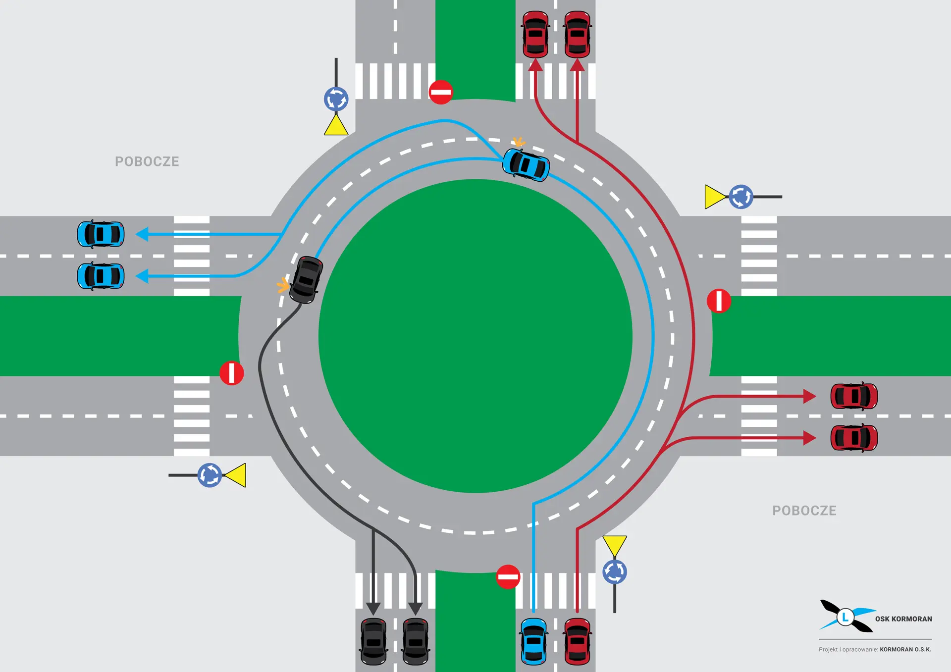 Wjeżdżając na omawiane rondo, kierowca ustępuje pierwszeństwa wyłącznie pojazdom nadjeżdżającym z lewej strony. Ruch odbywa się płynnie bez sygnalizacji świetlnej, dlatego prawidłowa obserwacja i respektowanie pierwszeństwa są kluczowe dla bezpieczeństwa.