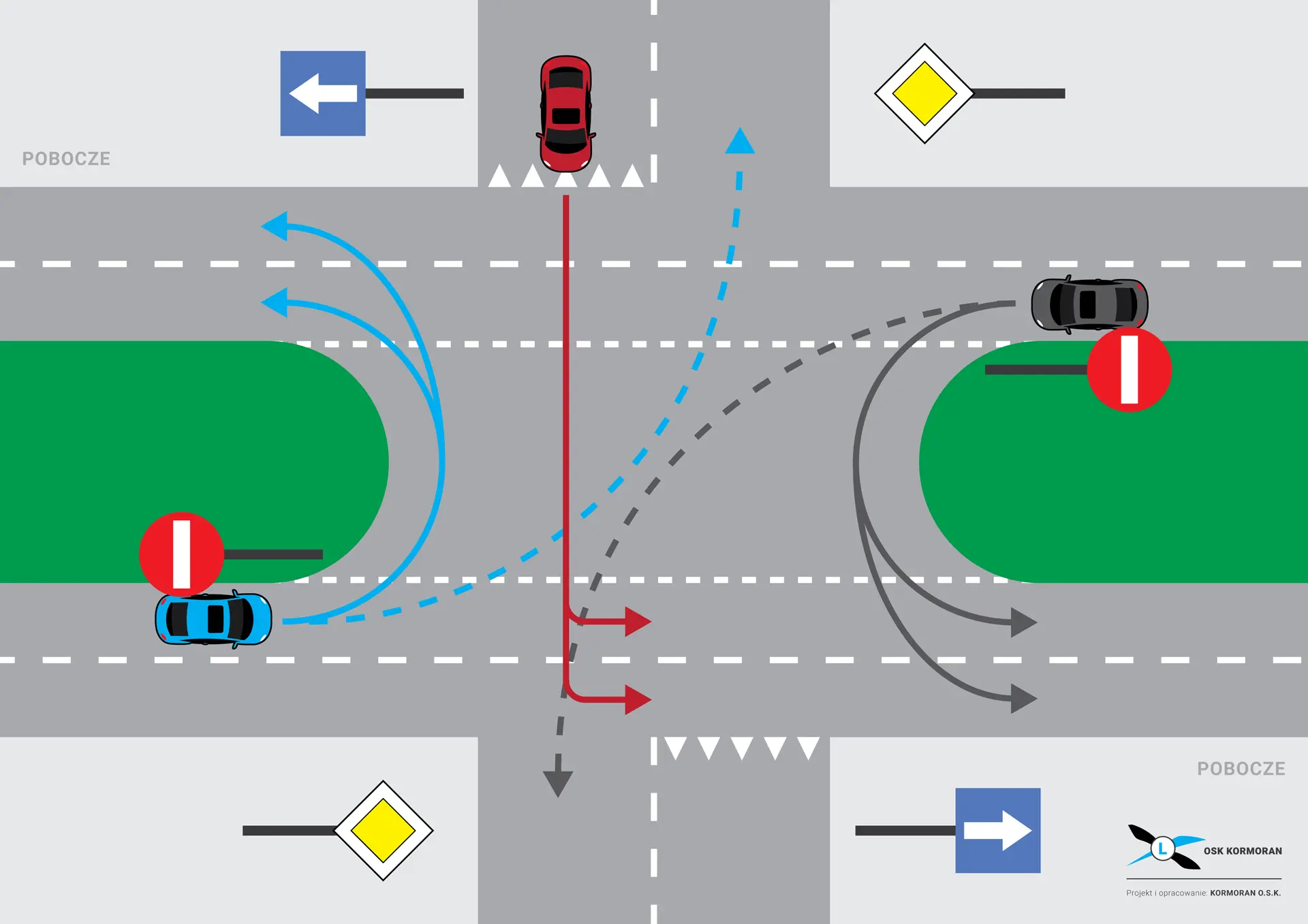 Na szerokim skrzyżowaniu pojazdy skręcające w lewo mijają się prawymi stronami, czyli tzw. „po angielsku”. Takie rozwiązanie ogranicza ryzyko kolizji i umożliwia płynne manewrowanie w obrębie skrzyżowania.