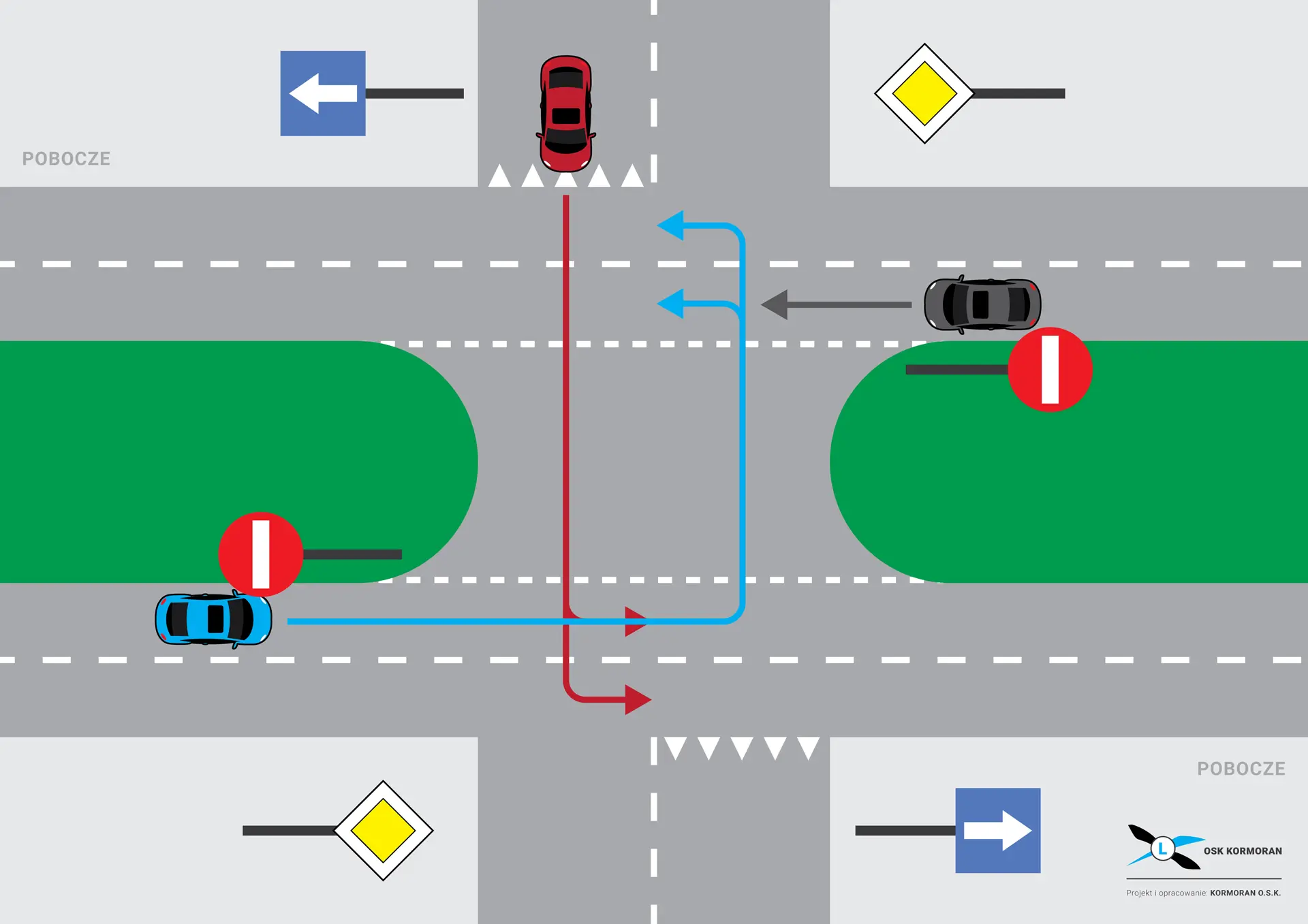 Na skrzyżowaniach tego typu manewry takie jak skręt w lewo lub zawracanie odbywają się przy wzajemnym objeżdżaniu się pojazdów z obu kierunków. Z uwagi na ryzyko kolizji i ograniczoną przestrzeń należy stosować następującą zasadę: